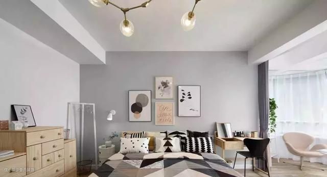 主卧选择铺设实木地板,浅灰色的背景墙简单的利用几幅装饰画进行点缀,软装上统一采用几何元素装饰,充满时尚现代感。