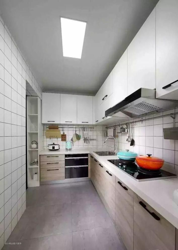 厨房是个狭长的空间,L型的布局刚刚好。灰色地砖、白色小方砖与木色橱柜的搭配,整个空间看起来格外的明亮清爽。