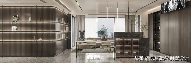 设计师在入户区域设计了一处玄关岛台,既起到隔断作用又能让居者到家就能品上微醺的红酒。原本电视墙的区域,做成收纳展示柜,造型美观又增加了客厅储物功能。