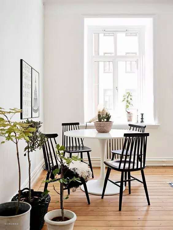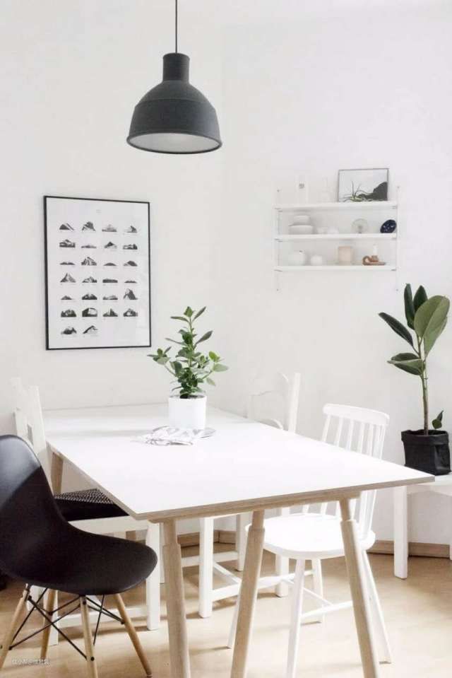 白色桌面+原木色桌腿,这个餐桌的选择与小编家里的一致。桌面与白墙融为一体,而原木色的桌腿则投入木地板的怀抱之中,大面积的白色与原木色成为这个空间的主色,而黑色的埃菲尔椅、装饰画框、花盆则提供了一个恰到好处的对比。