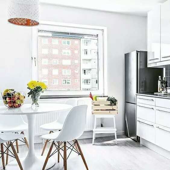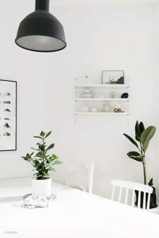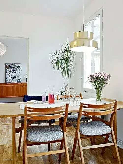 如果你家的餐厅是白墙+原木色地板,而且餐桌必须靠墙,那北欧君建议的还是第一个案例中呈现的那样——白色桌面+原木色桌腿。