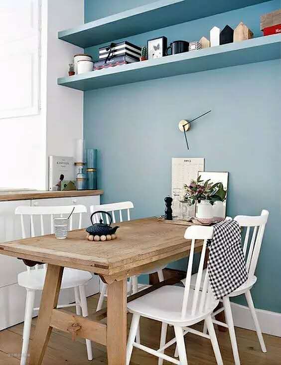 湖蓝色的墙面却选了原木色的餐桌,还好有四把白色的温莎椅才让这个空间显得不是那么的奇怪。如果把餐桌换成白色肯定是更好的选择,这样子在椅子的搭配问题上也会更加自由。
