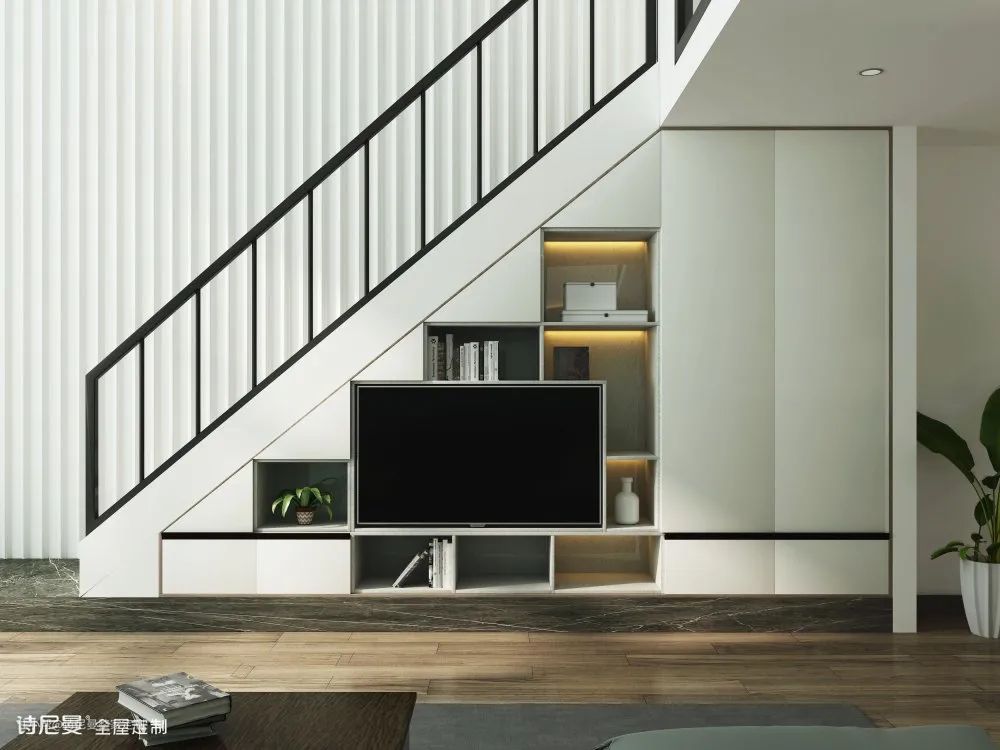 将楼梯柜延伸出来再制一面电视柜,