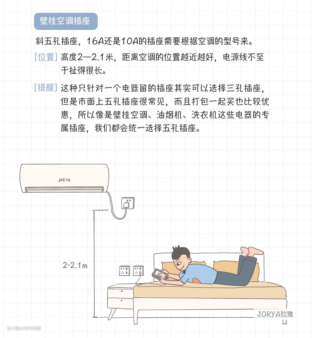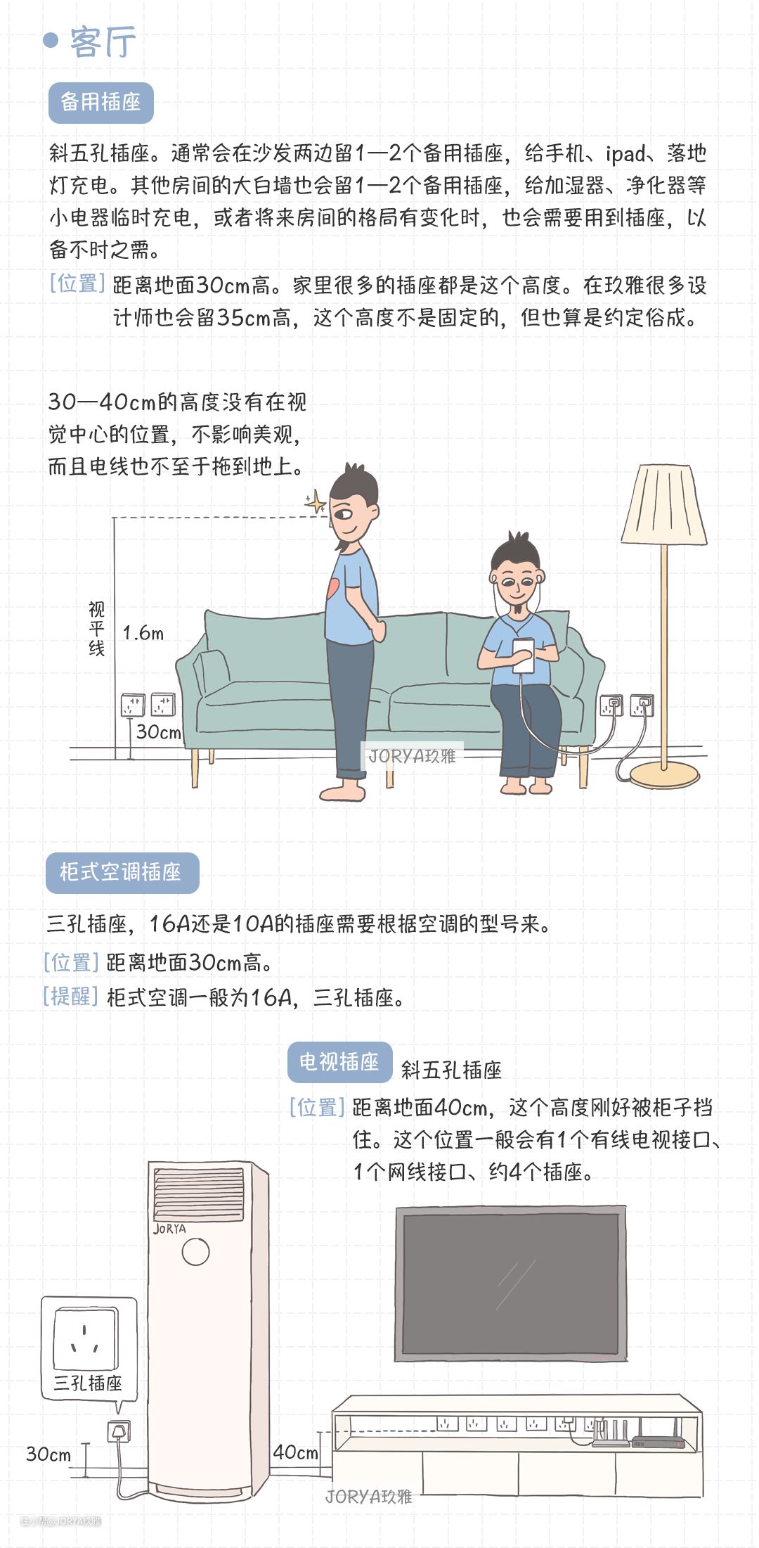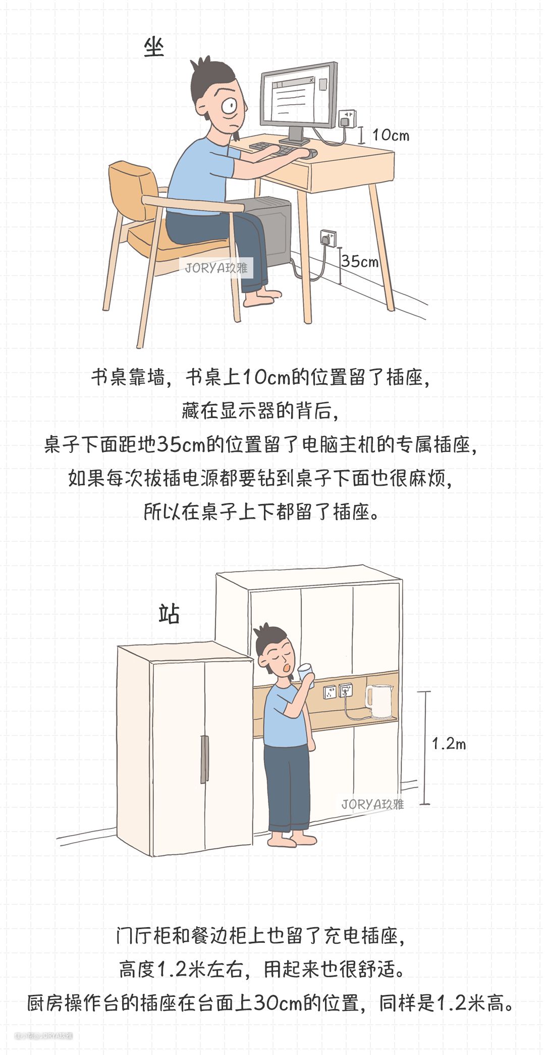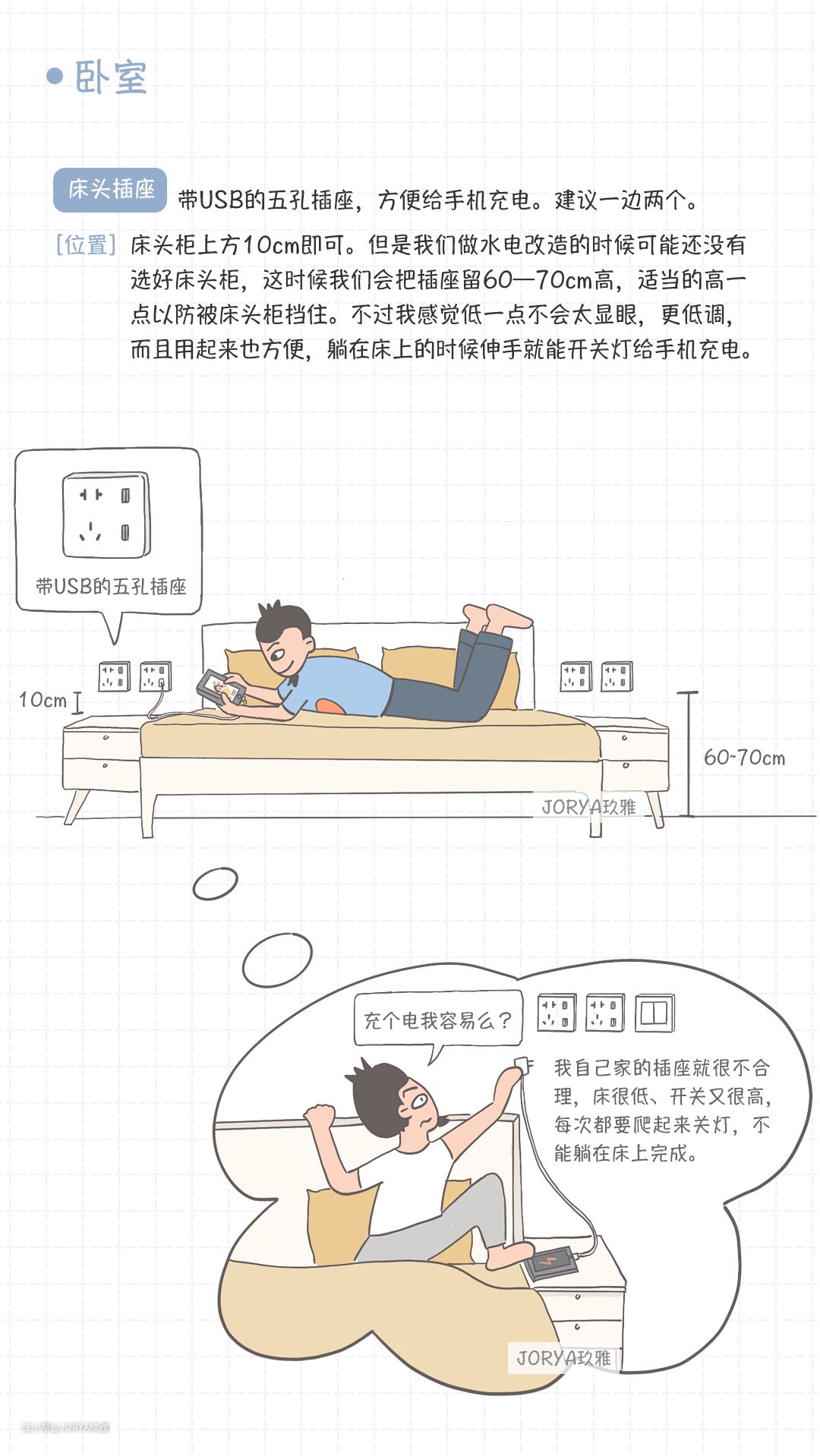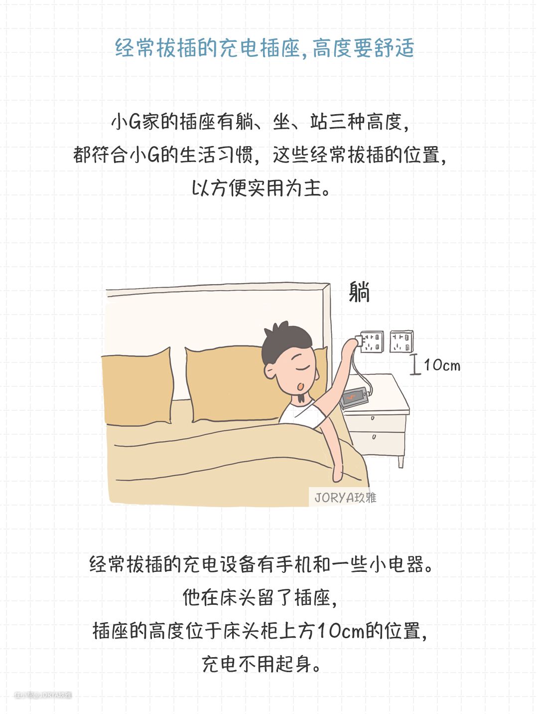 5、插座的位置分三种,经常拔插的充电插座位置要舒适方便;备用和不拔插的插座尽可能别太醒目;电器的专属插座要就近。
