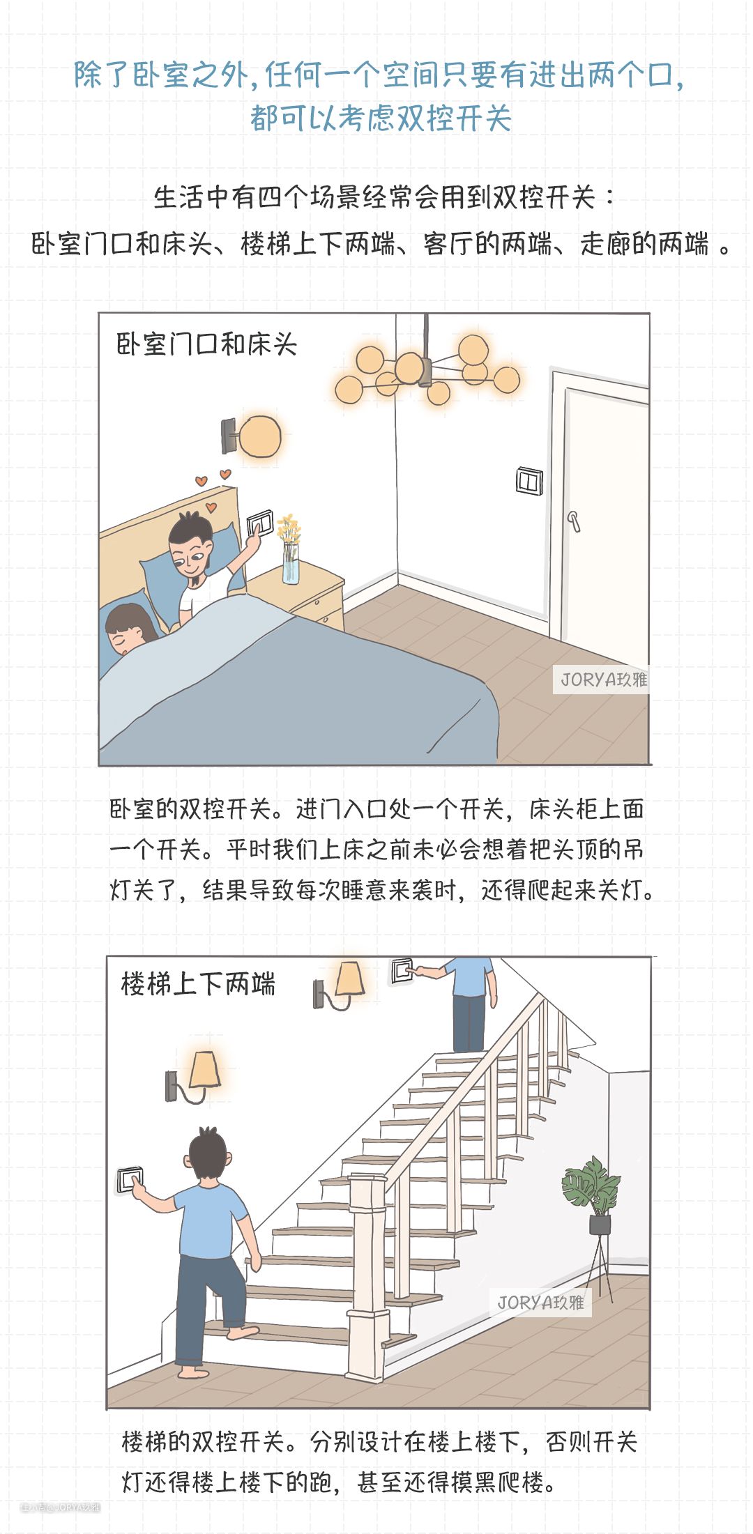 4、双控开关必不可少,卧室、客厅、楼梯、走廊都可能用得到。