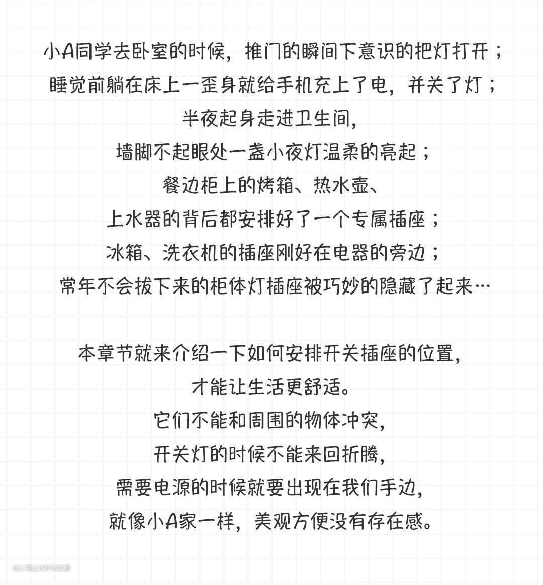 随着不同的生活场景的切换,不同房间的灯光也会随着人门的移动而关闭亮起、亮起再关闭…… 房间入口处是最理想的位置,但是还有很多细节要考虑,左右哪边更顺手,屋里屋外哪里更便捷省空间,会不会和家具冲突等等。我们在规划开关具体位置的时候要根据自己的生活习惯来。可以身临其境的想象一下平时的生活场景,比划一下如何走进这个房间?怎样把门打开的?又是用的哪只手开的灯?从房间出来的时候关门关灯又是怎样一系列动作?是不是一气呵成很连贯?