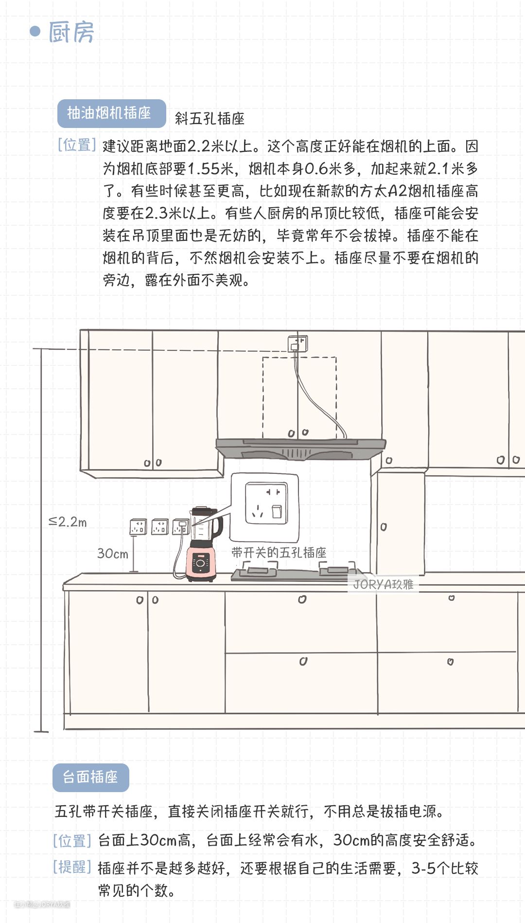 5、厨房(抽油烟机插座、橱柜柜体灯插座、嵌入式电器插座、台面插座、水槽下方的插座)