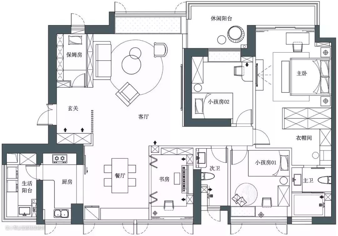 ▲ 双面开的大衣柜,解决床正对主卫门的弊端,同时增加储物空间