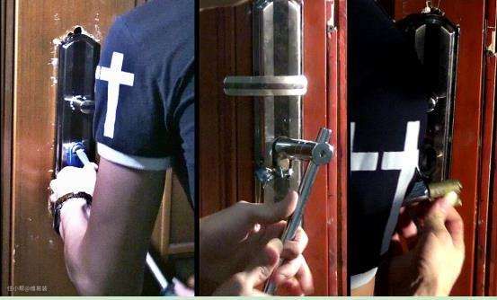 5、安装内外把手时,外把手要有人一起帮忙按住,然后对称迎合。