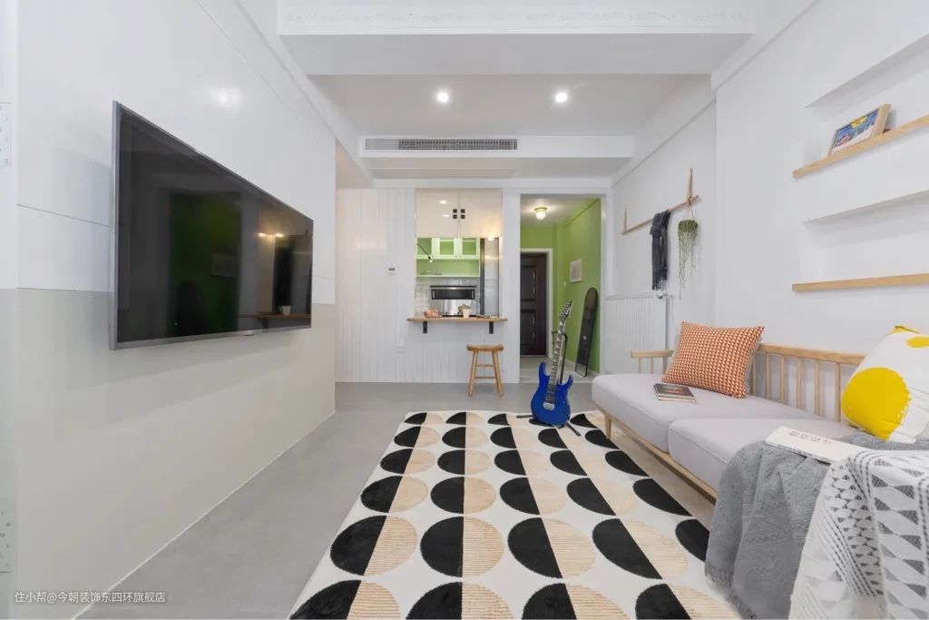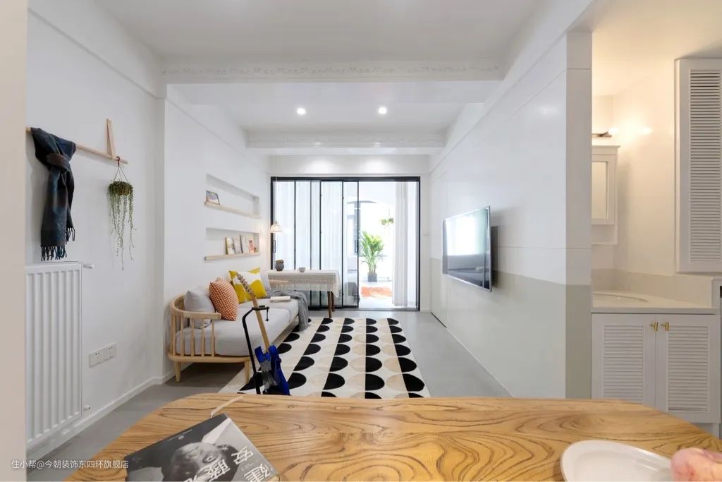 客厅的主色调白色为主,客厅占用了原有卧室的空间,原来入户的空间给了厨房,在厨房的墙面上开洞,用实木板定制了一个餐桌,满足一家三口的基本需求,因为厨房的使用空间不大,餐桌也可以当作吧台作为厨房的一个操作台面。