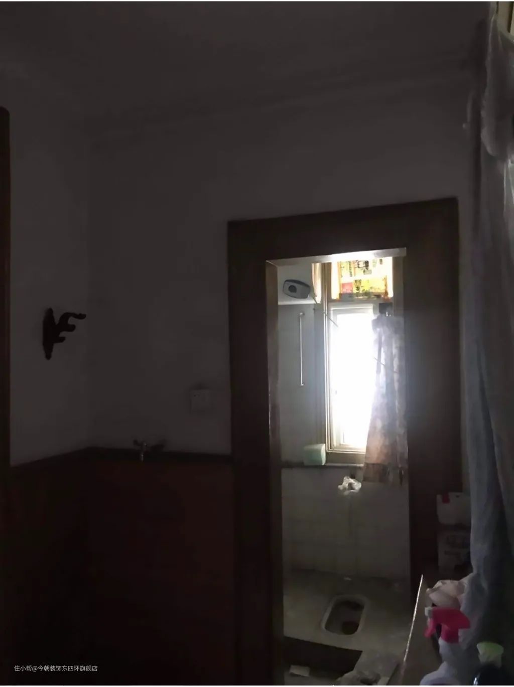 下边这张图是原来厕所的位置,门口的过道处比较浪费,由于有一个大柱子,这一块的位置不可能作为其他区域,在设计时把这里作为了一个功能超级强大的功能区。