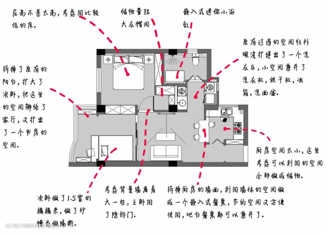 因为入户的光线比较暗,改造的时候我们把原有卧室的墙体拆除点,用了玻璃加纱帘的形式做隔断,增加入户自己客厅的采光,厨房采用半开放的模式,墙体开口,增加橱柜使用空间,并增加餐厅的功能,原有阳台拆除,改成了书房,增加了次卧的采光,次卧采用榻榻米的形式,增加储物空间,原有主卧缩小,扩大了卫生间的面积,挤压出一个衣帽间和浴缸的位置。卫生间采用干湿分区的形式,面盆,洗衣机烘干机冰箱全部在过道的位置,更方便使用。