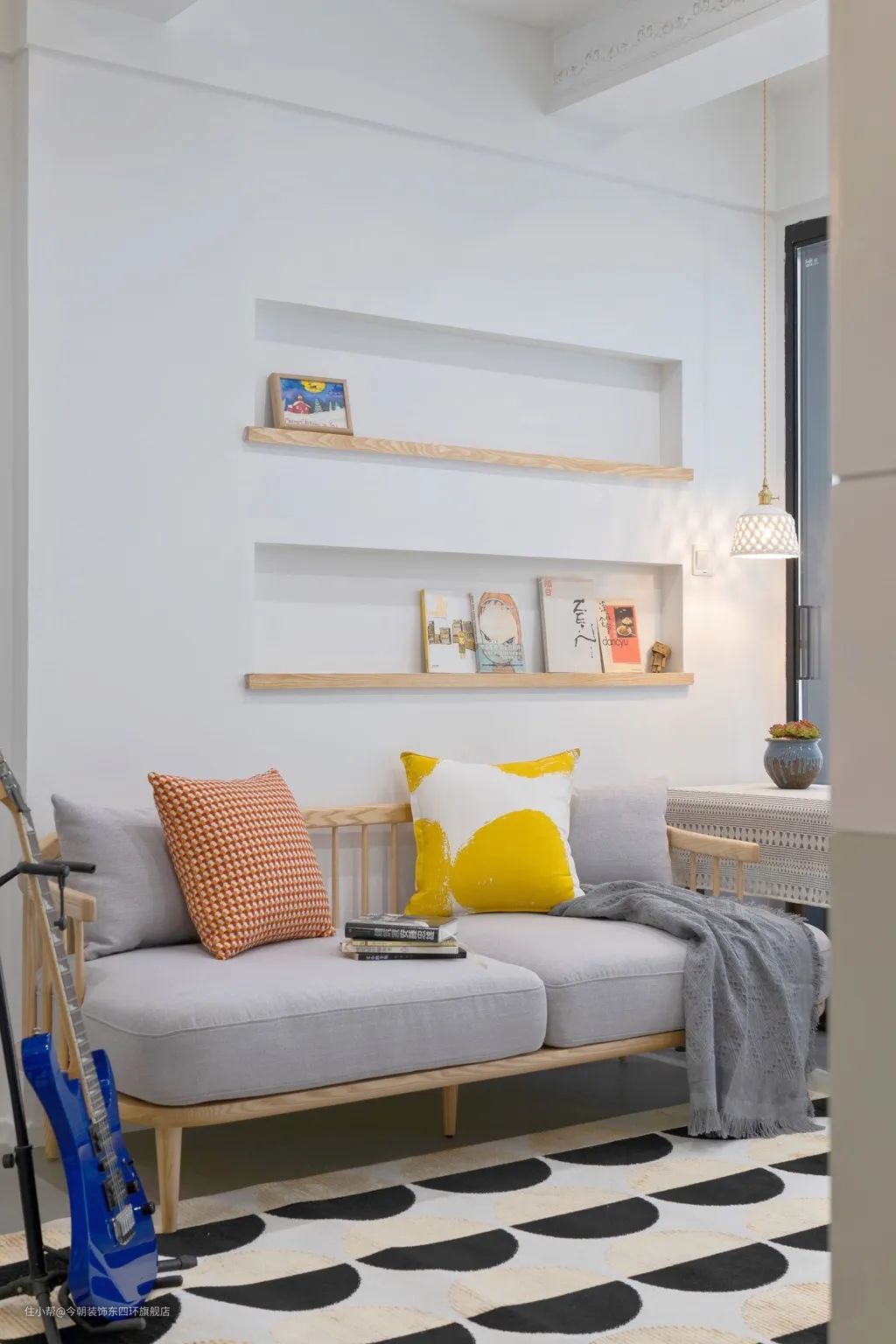 沙发后面有一个内嵌的尺寸,我把他封闭起来,做一个壁龛,用开放客厅的书物,客厅没有放茶几,旁边放了一个折叠的书桌,必要时抽出来当大桌子用。