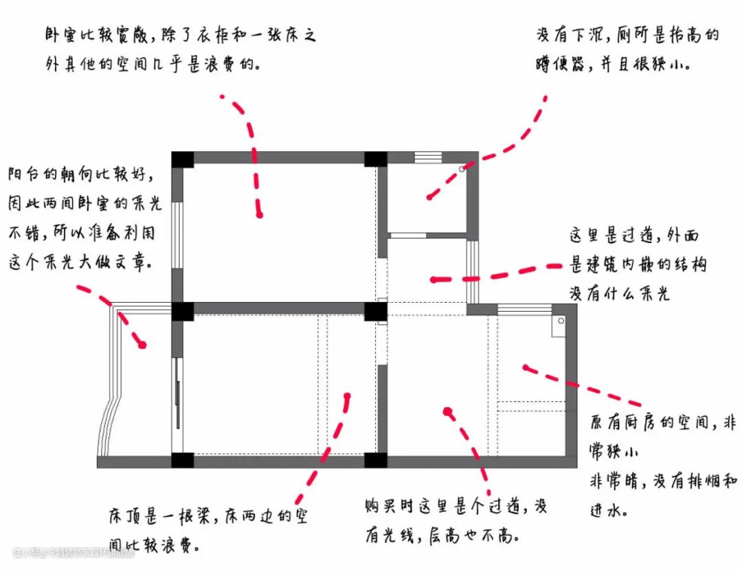 原有进门的空间是黑的,因为厨房这里的窗户是建筑内嵌的,厨房没有排烟孔,两间卧室比较大,出了基本的床和衣柜以外,还有比较浪费的空间,厕所没有下沉,非常小。