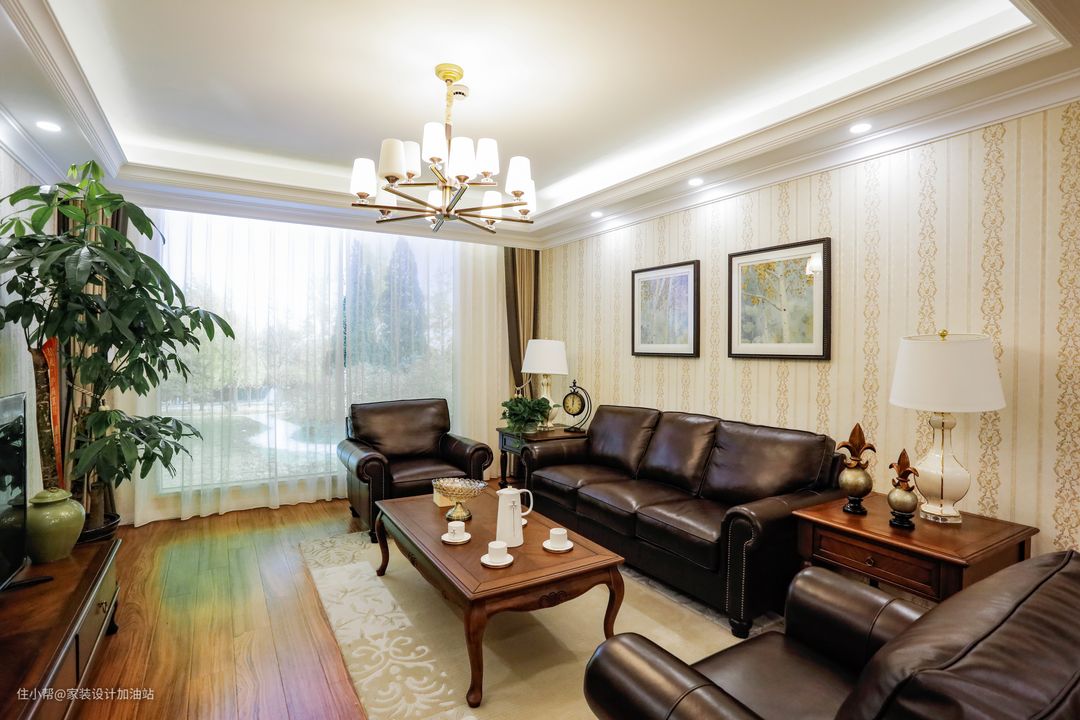 客厅地面选择铺贴木地板,提升了客厅整体空间的温馨感,客厅顶面选择用回字吊顶做造型,吊顶内隐藏有灯带+射灯的设计,为客厅空间提供辅助光源,中央的大吊灯看上去也不过时,让客厅整体亮度变得更加明亮。