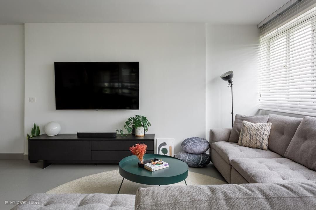 其中客厅布置得最为清爽大方,大白墙不做丝毫的装饰,搭配浅灰色的沙发,简简单单最为养眼。