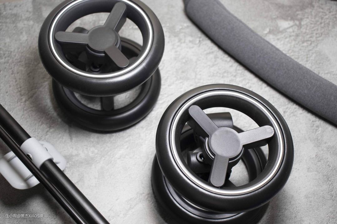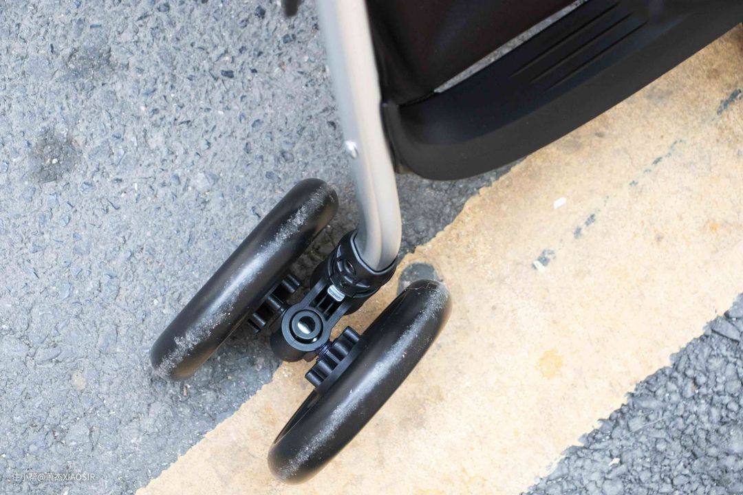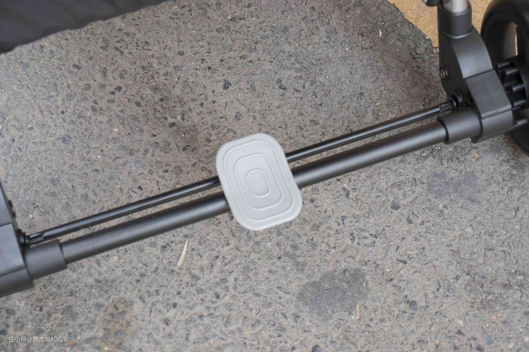 刹车系统很重要,遇到坡道、需要停下车拿东西时,务必要把车刹住,无论是手刹还是脚刹,可以刹车并且锁定住的功能很重要。qborn百灵婴儿推车就有这个功能,后轮之间由横杆连接,配置了一个脚式刹车踏板,轻松踩下就可以立即制动。