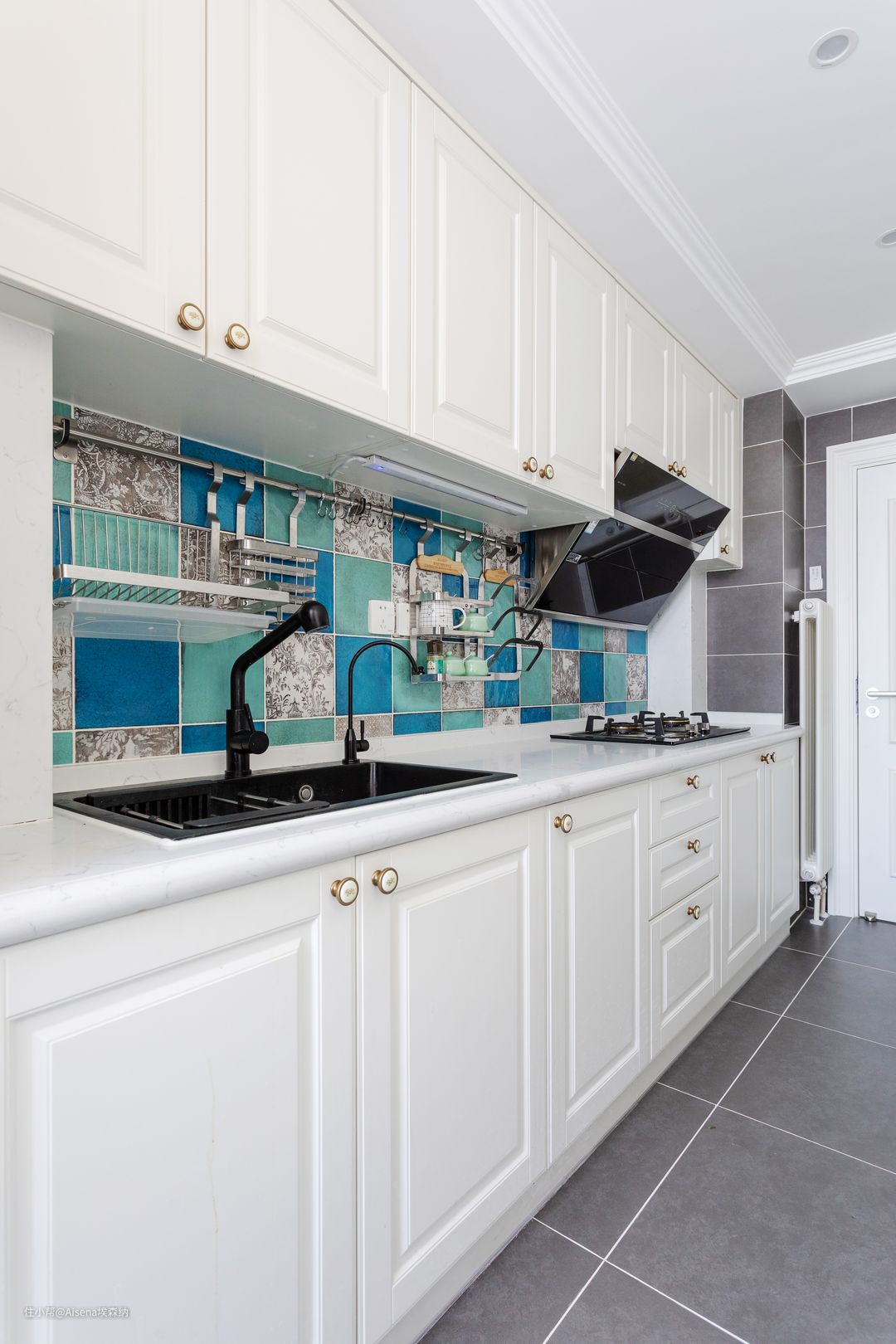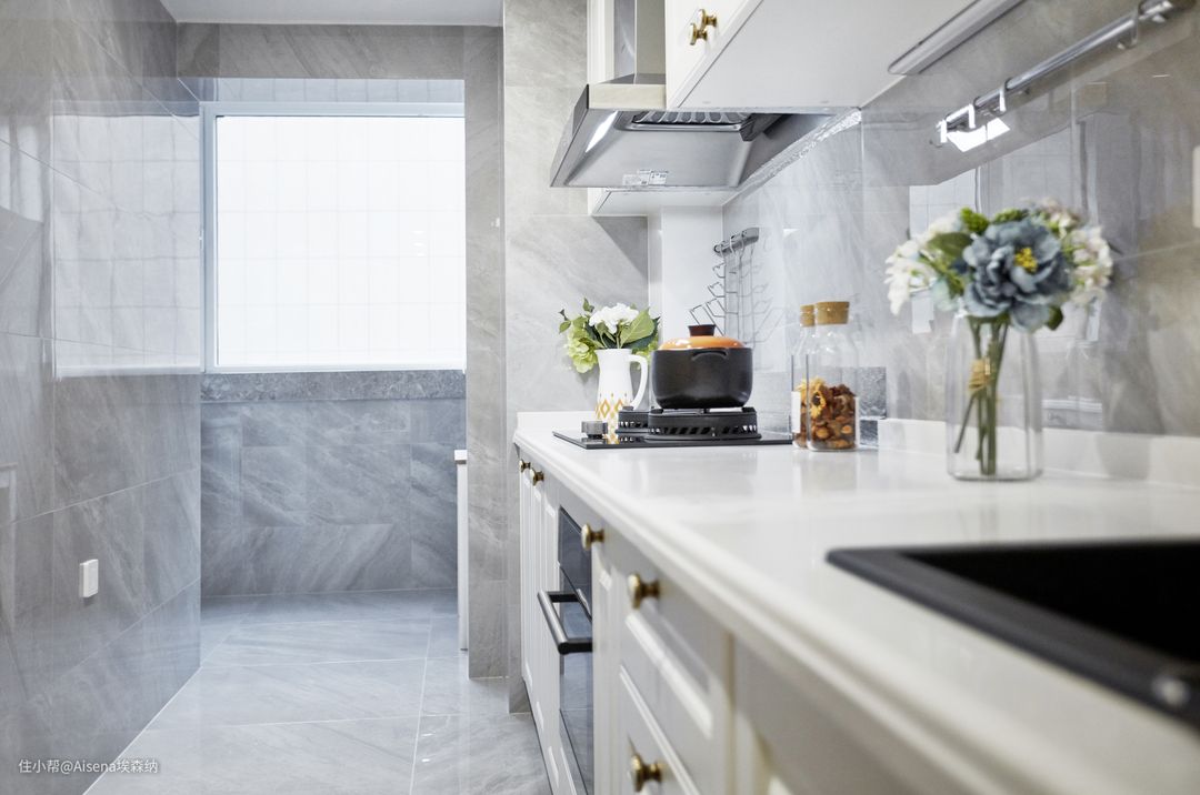 ▼狭长的厨房,两边都设计了多功能橱柜。“香草天空”样式的吸塑造型橱柜配白色大理石台面这一经典组合有助于保持厨房整洁,美食在干净卫生的环境中诞生。