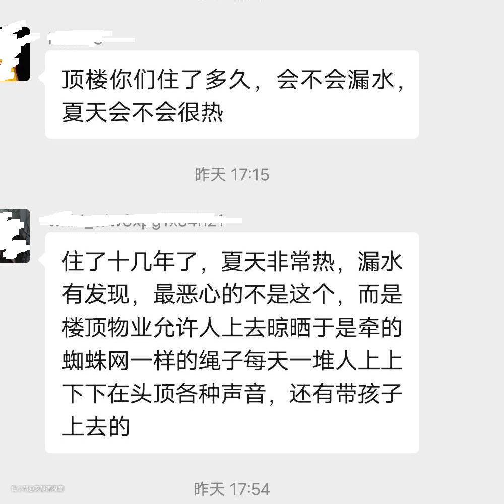 很多网友都会想到这一点,换成顶楼是不是就没有噪音了?确实会好一点,但是低频噪音会通过墙体和楼板向上传递,楼上不吵了,楼下噪音又来了,因为你们的墙体连在一起的。而且冬冷夏热,还要承担外墙渗水的风险等。