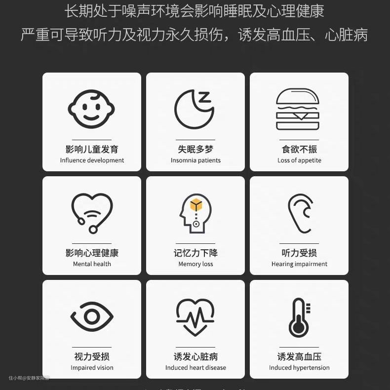 长期遭受家居噪音的侵扰,不止健康受影响,还有精神上的摧残,长期经受噪音会出现:心烦、暴躁、焦虑、抑郁、头疼、失眠、易受惊吓、精神萎靡、反应迟钝、植物神经紊乱等。特别对儿童的成长发育危害很大,家有老人的有可能诱发突发疾病等。