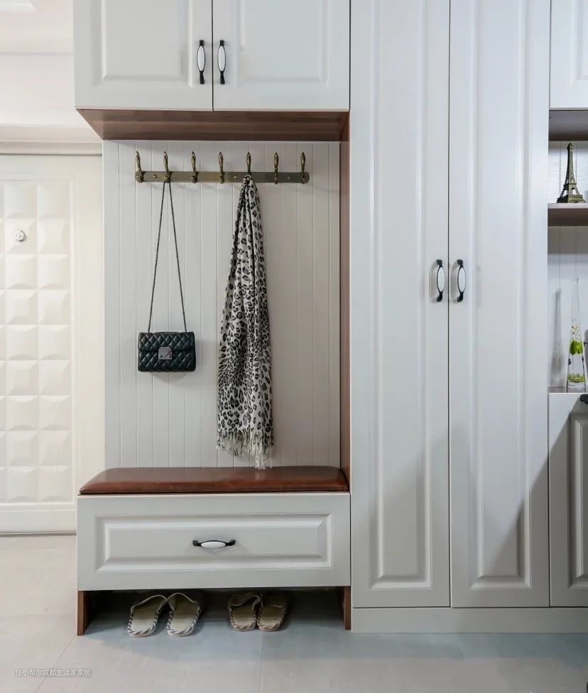 ·方便入户脱衣换鞋:把鞋柜、衣柜等设置在玄关,可以方便进屋换下外套与鞋子。同时设置多联灯光开关,进屋不摸黑。