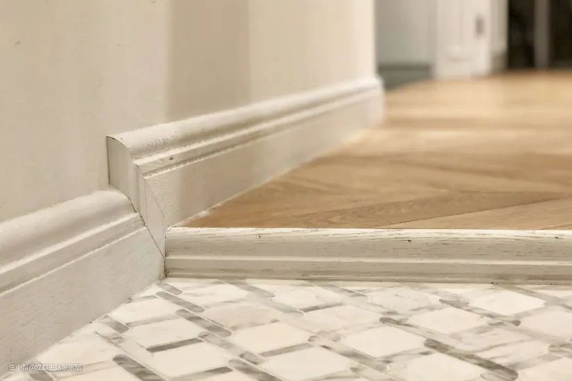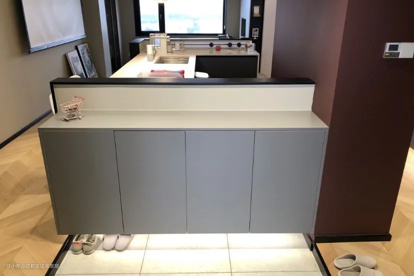 这个时候,如果空间不够大,直接在入户门前方设置隔断便会很奇怪,也影响通透性。正确的做法是将收纳柜置于一侧,并与入户门平行。