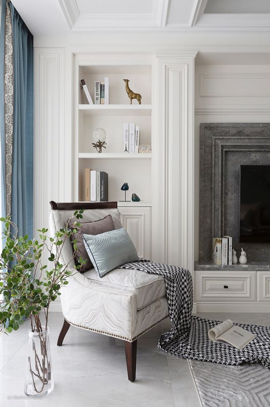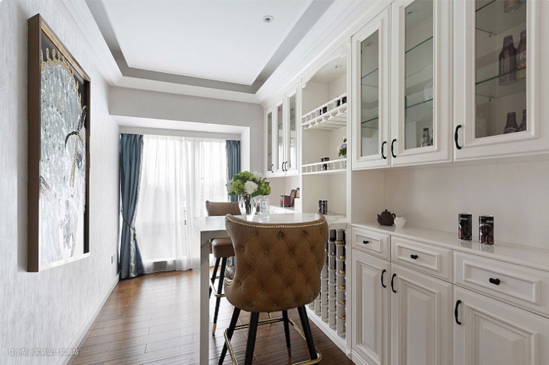 一入客厅就被这优雅大气的氛围给吸引了,屋内多处运用到了经典的美式线条,例如到顶细节和半护墙板以及柜子细节,营造了极强的层次氛围。虽然色调上整体偏浅色,但照样很有空间感。