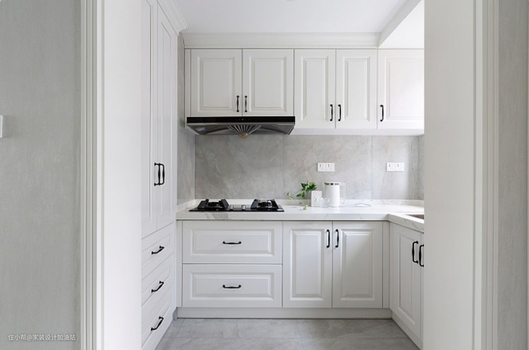 严格来说,内部是L型的橱柜布局,不过左侧实际是一台和橱柜一体化的嵌入式冰箱,让冰箱功能和柜体完美融合,屏蔽卫生死角,美观大气。