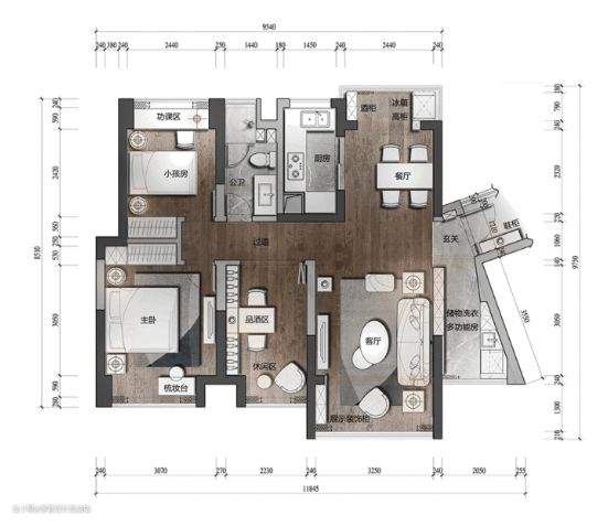 至于玄关区域还有一个洗衣晾晒的阳台,因为图源有限就遗憾不能展示了,大家可以在户型图中看到详细布局。