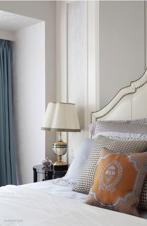 高级灰色系延续到主卧的墙面,床头背景墙采用了半护墙+灰色哑光皮质软包的设计,主次分明效果超棒。