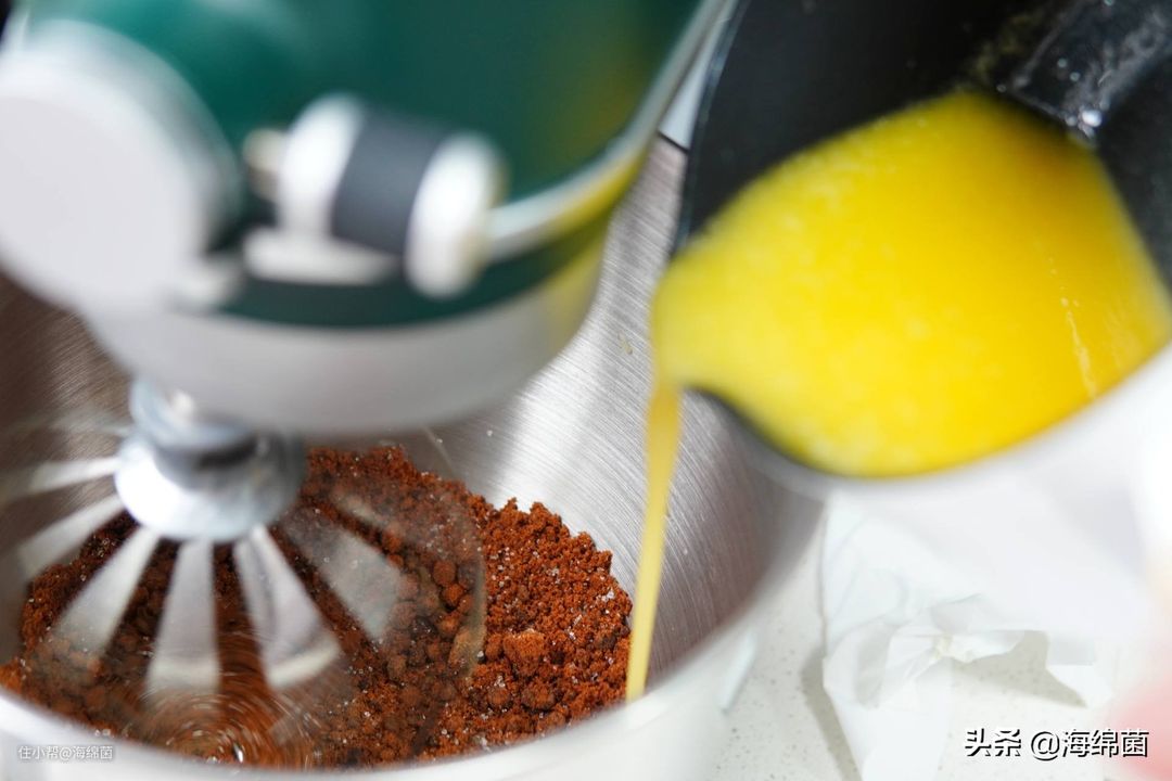 倒入融化的黄油,注意缓慢倒入,不要一下子倒太快弄得到处都是:
