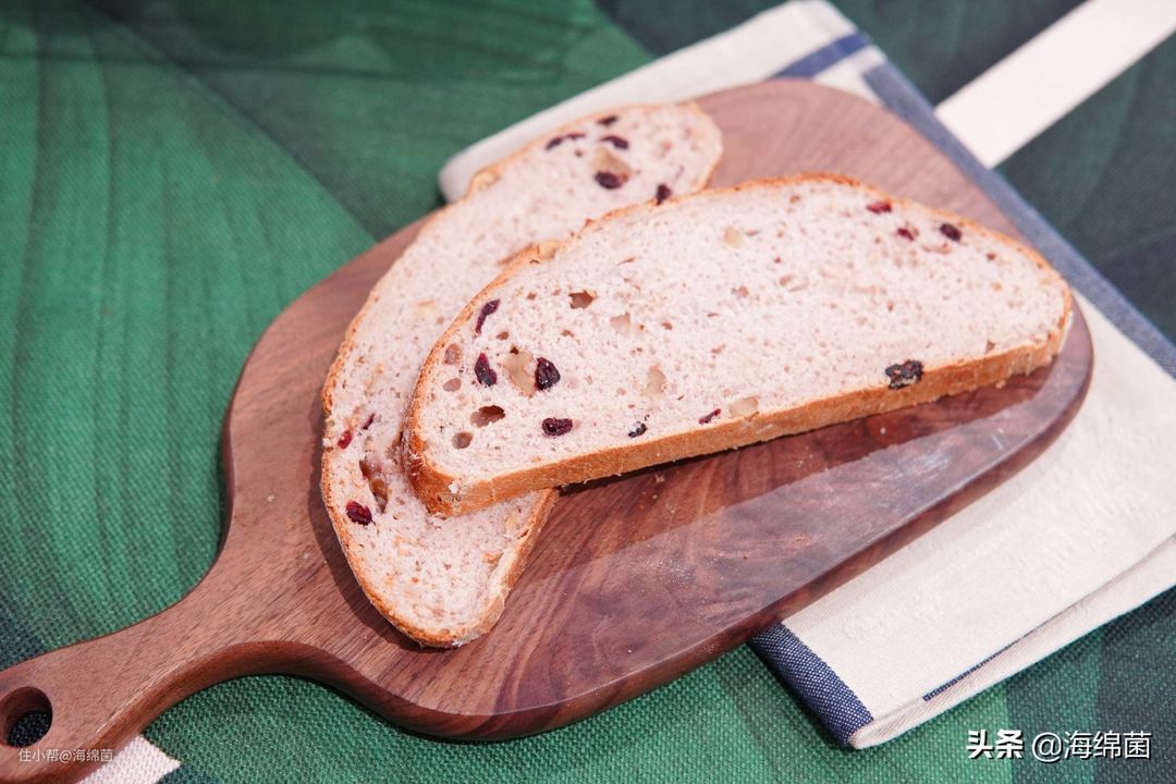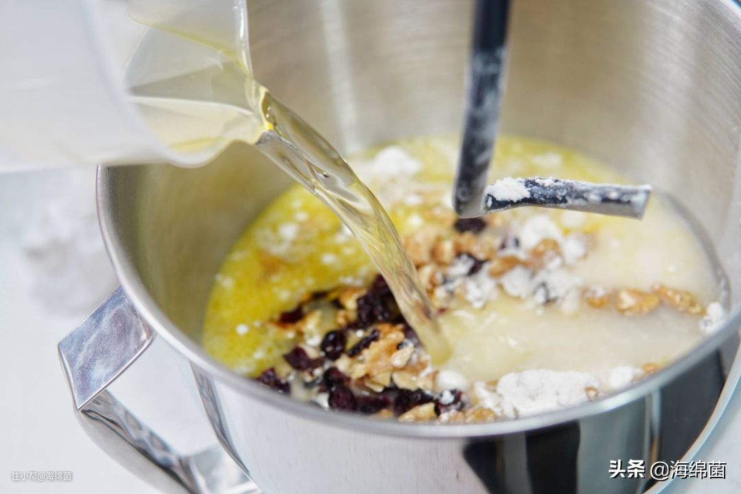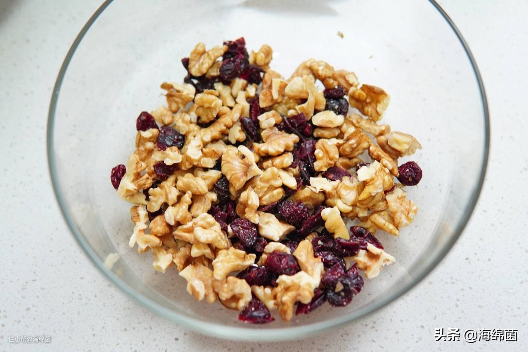 核桃仁如果是整颗的,可以掰碎成3-4块。蔓越莓干是为了增加口感上的甜度。