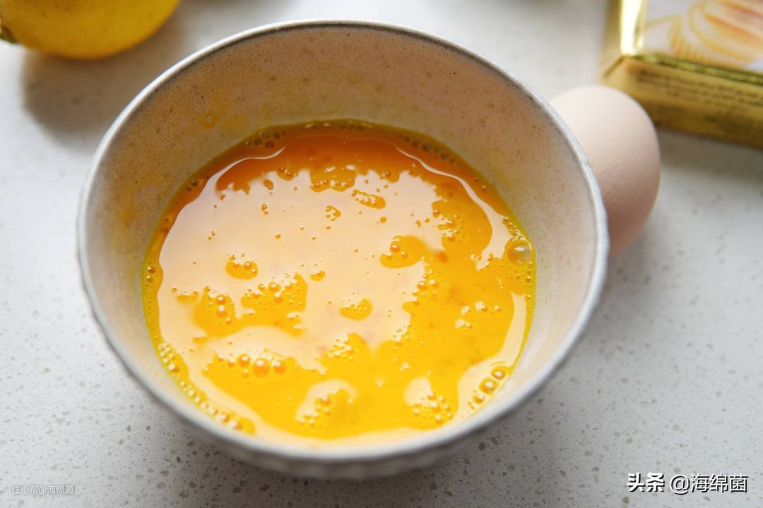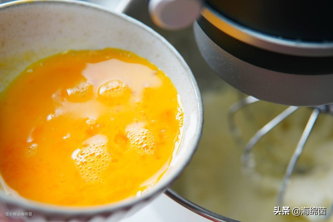 准备200g的蛋液,做磅蛋糕的时候记住蛋液量和黄油的量是一样的就行,同时鸡蛋也要从冷藏里拿出来回温,和黄油一起取出即可。