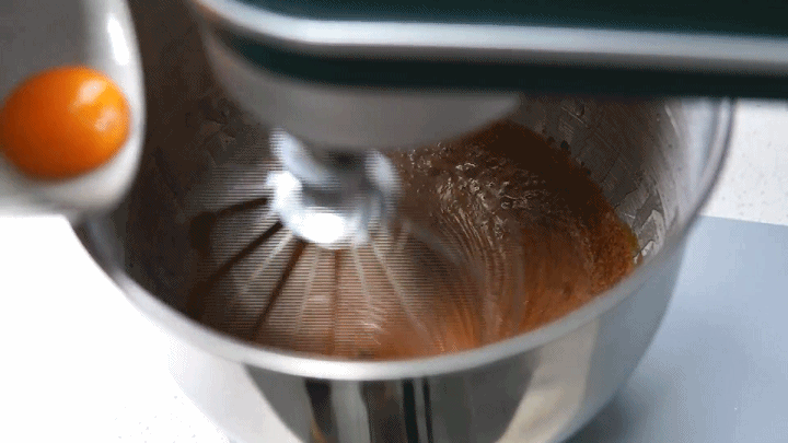 无需调整厨师机,从碗口边缘,依次加入全蛋和蛋黄,注意一个一个加进去,鸡蛋很快会融入黄油糖浆中: