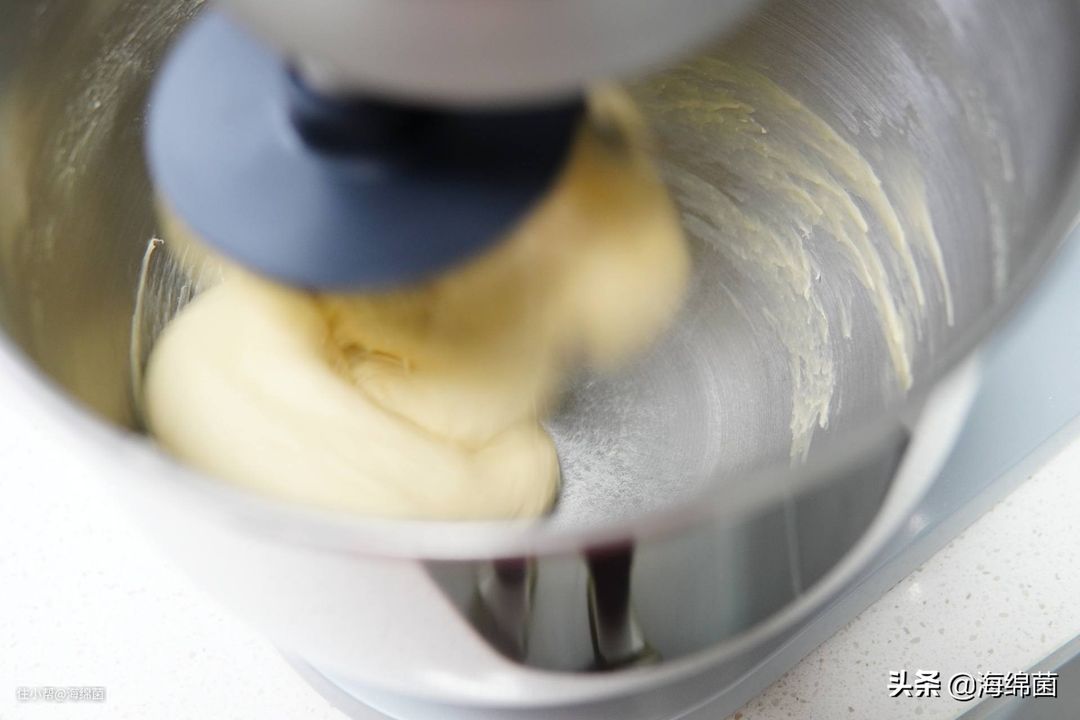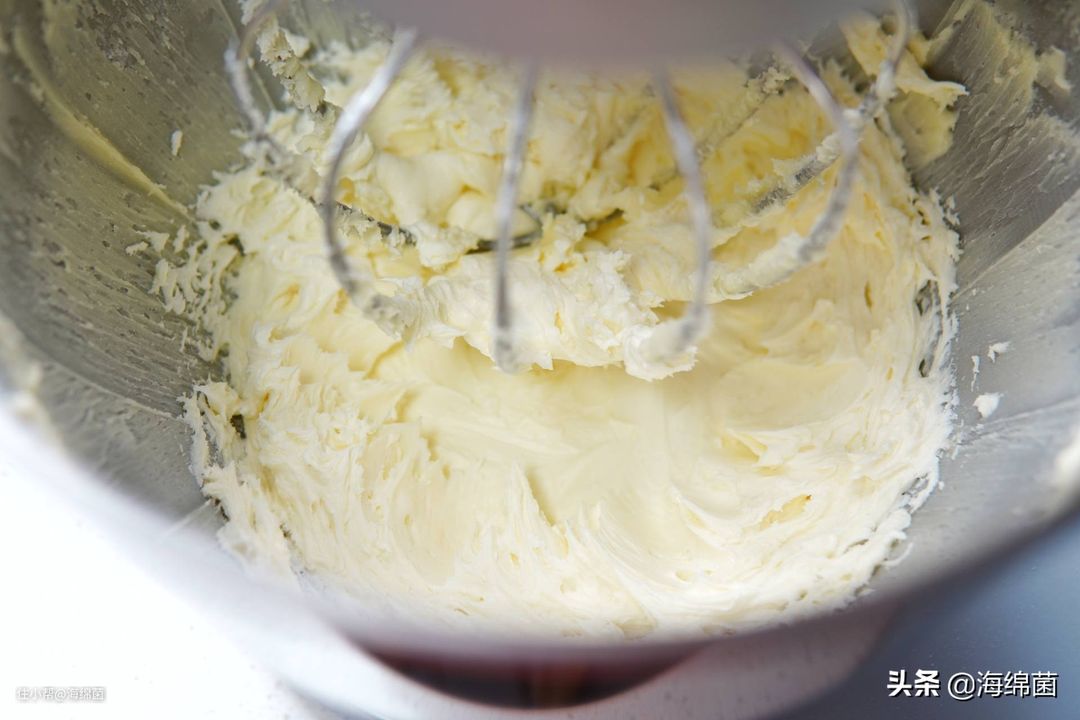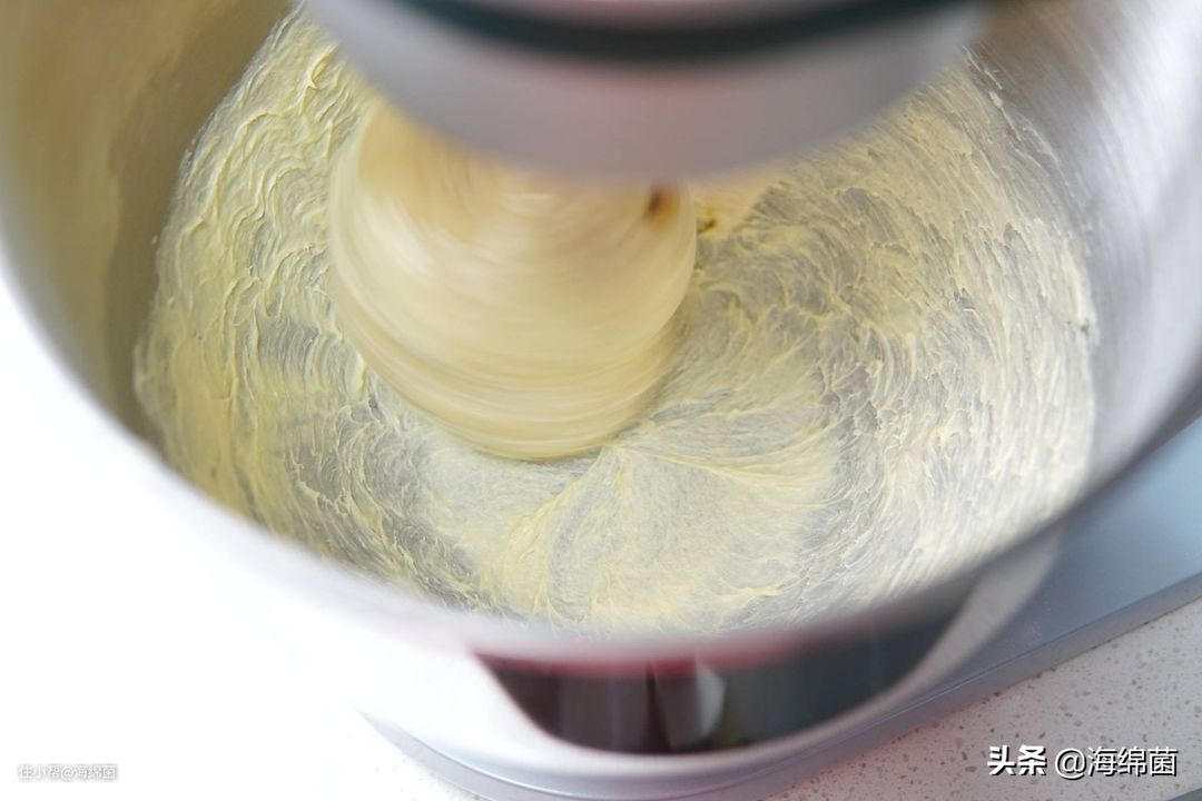 打发过程中如果碗壁上有黄油粘附可以用硅胶刀稍微聚拢下,等黄油颜色变浅,体积膨大就可以停止了,差不多2分钟的时间。
