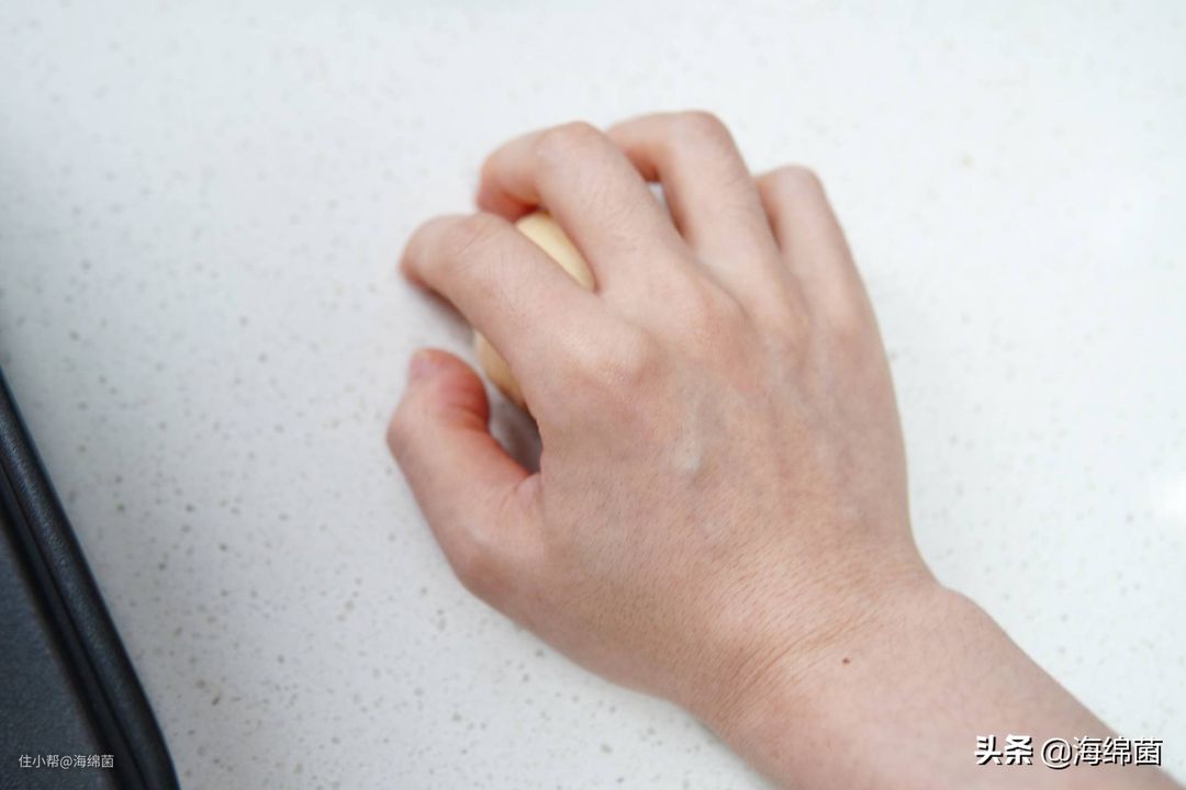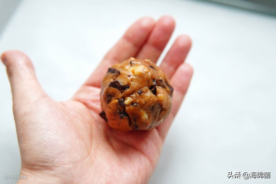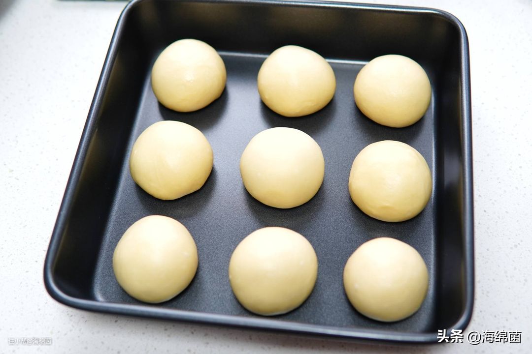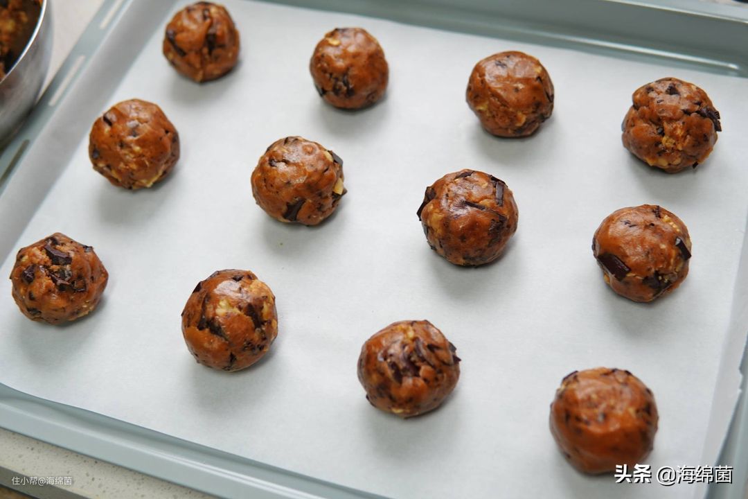 面团放在案板上,手掌呈爪状,略带空心的揉搓面团,就能形成光滑的圆球,之后均匀的放入烤盘中。
