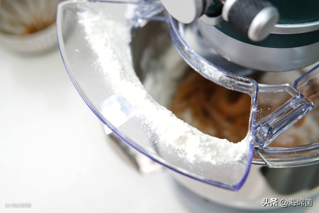 将过筛好粉类一点一点倒入厨师机搅拌碗中: