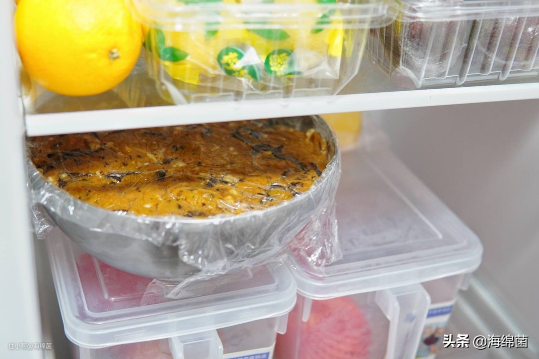 蛋糕放凉到残留微微温感,用保鲜膜或者密封袋装好,夏天放冰箱冷藏一夜,天气不热的时候常温放置就可以,第二天回油之后切片食用,味道会更好。