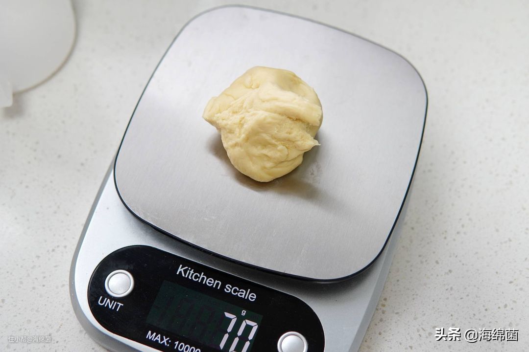 之后将面团整体称重,均分9团,我称下来是630g,分成9团后刚好是70g一团。