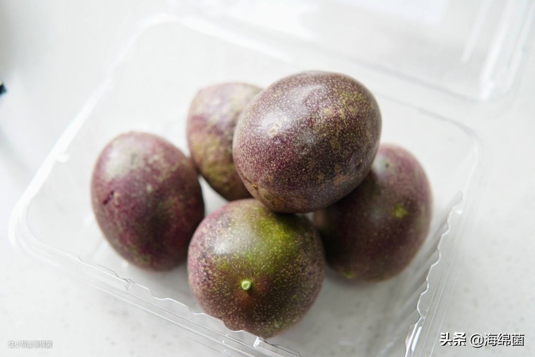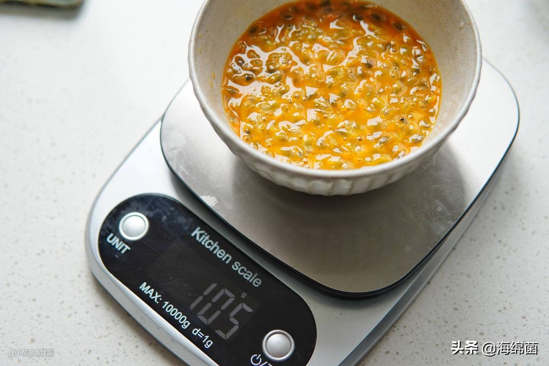 百香果直接对切,挖出果肉即可,多一点少一点问题不大,我切了3个中等个头的果子就得到了105g的果肉+果汁,如果是小果的话,可以切4个。