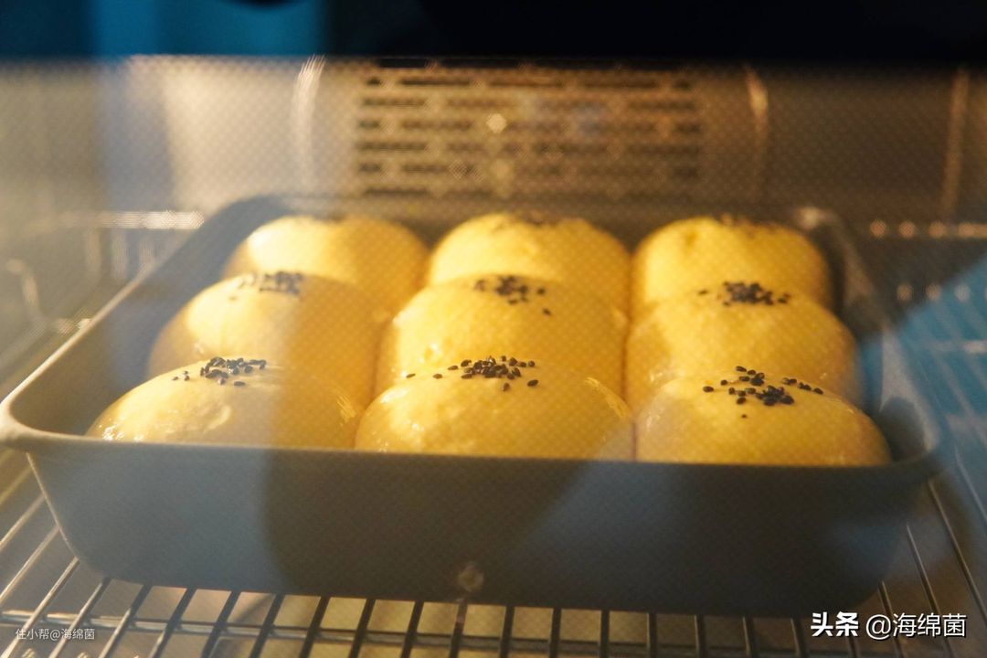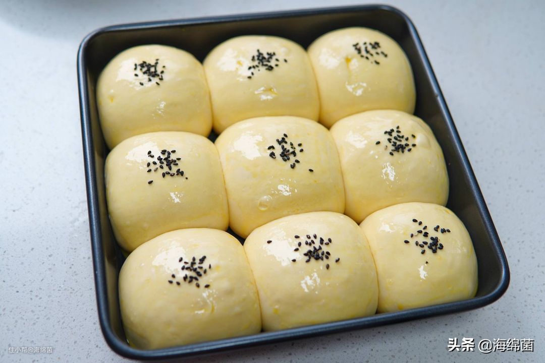 白白胖胖的面团发酵完成后,可以适当刷上蛋液再撒一些装饰,比如黑白芝麻,椰蓉之类的,这个可以根据个人喜好。