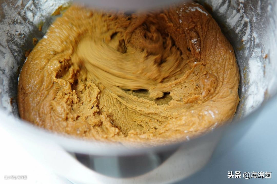 厨师机调整到3档,让糖类和黄油充分混合: