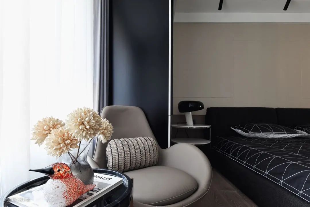 ▲卧室在现代简雅的空间下,床侧边的衣柜+梳妆台组合,黑白配的设计搭配,为女主人提供了一个实用方便而优雅的梳妆打扮体验。