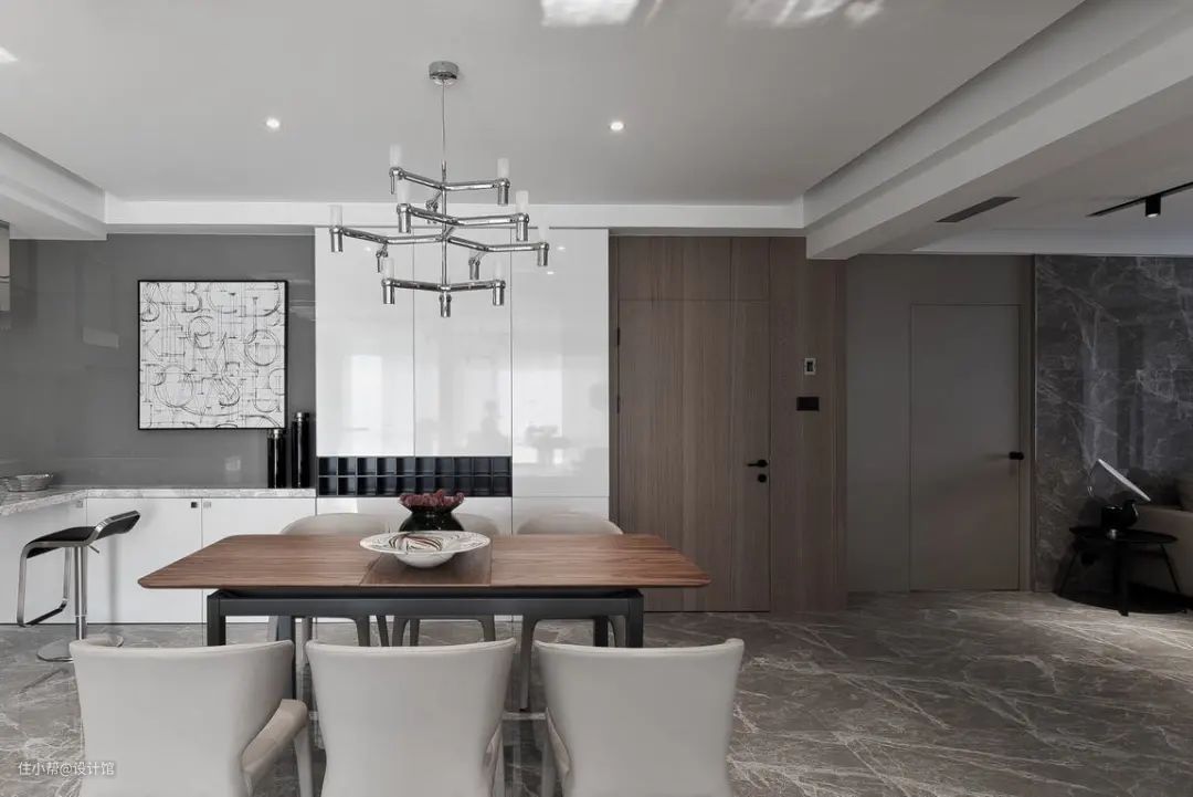 ▲餐厅与客厅连通的竖厅格局,采光与通风都得到了保障,在现代简洁的空间下,布置木质餐桌、皮艺的餐椅,侧边定制黑白配的餐边柜,整个空间显得格外的现代优雅而高级。