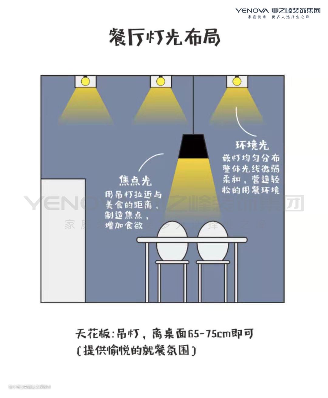 餐桌灯光设计记住一个规则:基础照明选筒灯,餐桌照明选吊灯。需注意:吊灯高度离桌面60cm左右;吊灯的光源建议选择暖色光源,让人更有食欲。