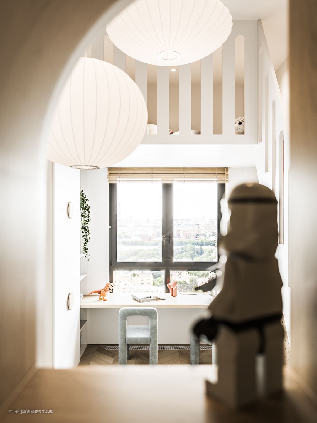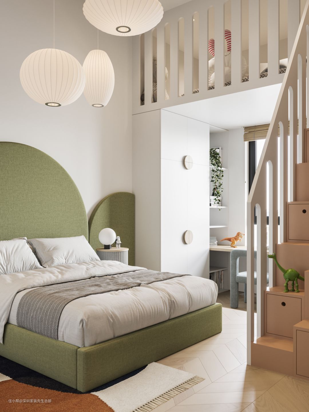 儿童房由床铺及二层游戏区共同组成