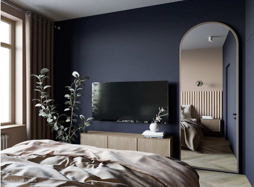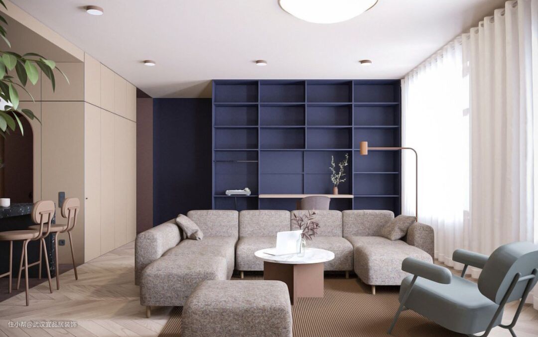 入沙发背景使用了KD木饰面,蓝色开放的展示柜,除了方便随时阅读,还可以放一下喜欢的物品展示出来,体现生活精致。