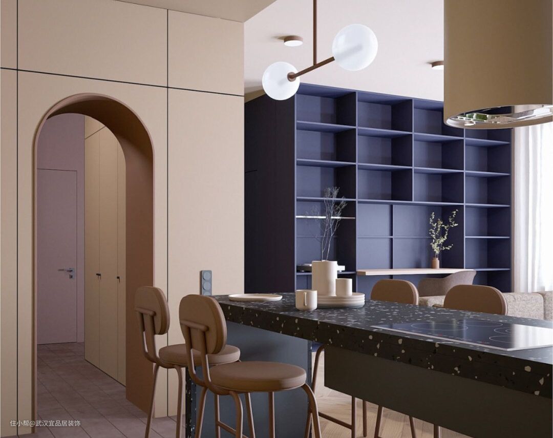 高级灰蓝色和原木的结合,让空间呈现出一种柔和的色调,不规则的大理石长桌像是置身在森林身处的小木屋里。