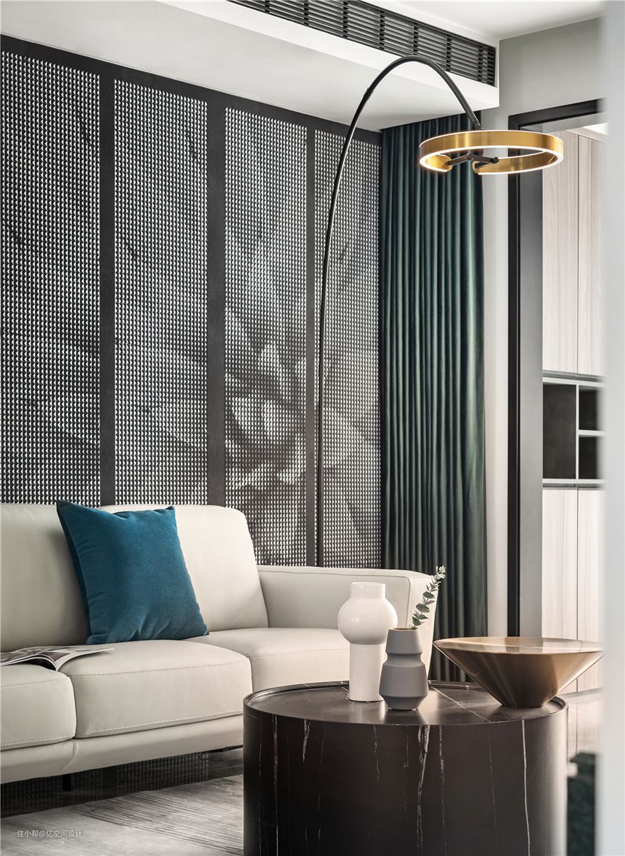 沙发背景墙采用黑白相间的壁布,勾勒出细腻的层次感,如同将生活中琐碎闪烁的美好收拢进来,只待不日将它取出,细细品味。