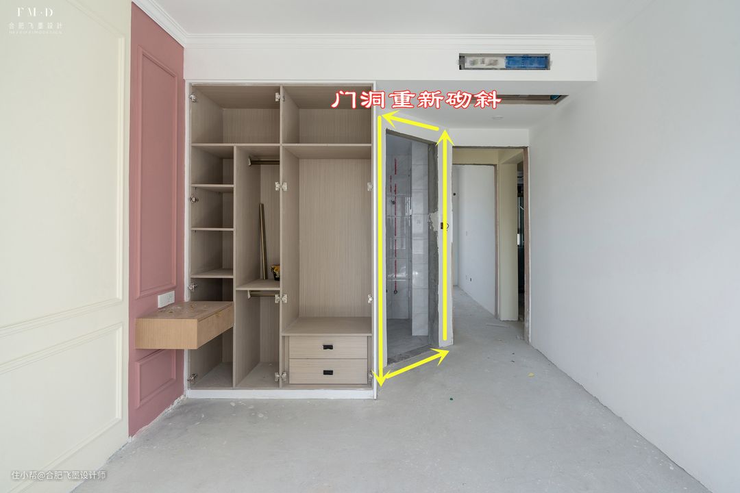 其实就是在衣柜后重新做个侧门,拆了门洞现场砌砖墙,做个斜门洞,这样不就达到了既保留了卫生间,同时也改变了门洞的朝向?瞬间化解了对着床的尴尬,也不会影响到卫生间的通风采光。